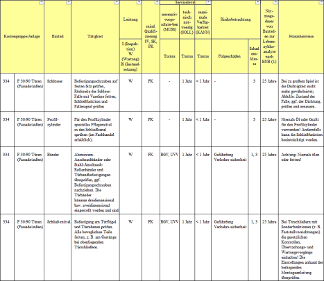 Ein weiterer nützlicher Bezugspunkt für die Wartung von Gebäudestrukturelementen findet sich bei RSMEANS. Allerdings ist es nur auf Englisch verfügbar. Siehe Anhang 19 mit dem Titel "Ein informelles Beispiel für Wartungsanweisungen aus den USA", das die notwendigen Details am Beispiel von Türen zeigt.