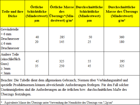Ob der Zinküberzug nachbehandelt oder zusätzlich beschichtet werden soll und Vereinbarungen über Abnahmeprüfungen gemäß der Norm Mindestschichtdicke und Masse von Zinküberzügen auf Prüfteilen, die nicht geschleudert wurden (Tabelle: DIN EN ISO 1461).