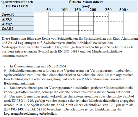 Auch bei diesem Verfahren muss die Oberfläche gründlich gereinigt und mithilfe eines geeigneten Strahlmittels ausreichend aufgeraut werden. Das Ziel des Strahlens ist erreicht, wenn die Oberfläche ein metallisches Aussehen „mit einheitlicher Struktur gemäß EN ISO 8501-1, Grad Sa 3 aufweist.“ Das Spritzen muss unmittelbar danach erfolgen, damit die Oberfläche (noch) trocken, staubfrei und frei von Rost, Zunder und Fett ist. Eine Maßnahme zur Qualitätssicherung ist der Vergleich der nach dem Strahlen erreichten Oberflächenrauheit mithilfe einer (zwischen AN und AG vereinbarten) Referenzoberfläche. Die Mindestdicke der Schichten der aufzutragenden Oberflächen (Zink, Aluminium oder Zn-Al-Legierungen) sind in der folgenden Tabelle dargestellt.