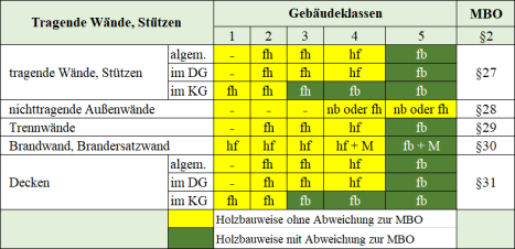Die Anwendung der Holzbauweise mit oder ohne Abweichung von der MBO ist in nachfolgender Tabelle beschrieben.