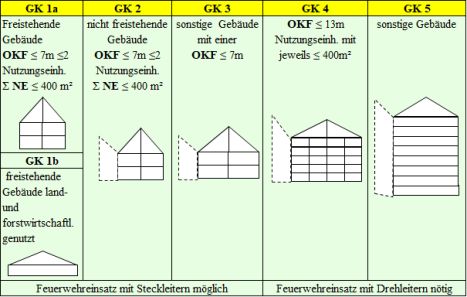 die Gebäudeeinteilung in Gebäudeklassen (GK) 1 - 5.