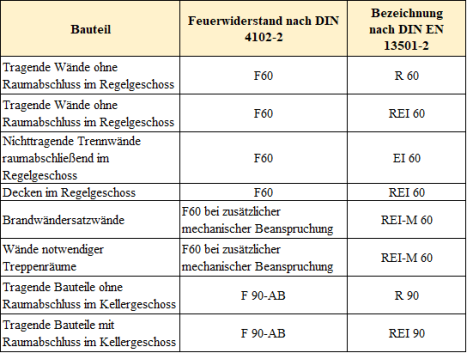 Die folgende Tabelle beinhaltet die brandschutztechnischen Anforderungen an Bauteile in der Gebäudeklasse 4 gem. MBO.