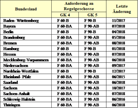 In den Landesbauordnungen gibt es (leider) unterschiedliche Vorgaben bezüglich des Brandschutzes von tragenden, aussteifenden und raumschließenden Bauteilen in Gebäuden der GK4 und GK5. Die folgende Tabelle zeigt diese unterschiedlichen Anforderungen.
