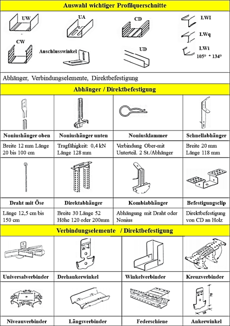 Die folgenden beiden Tabellen zeigen Übersichten über die wichtigen Standardprofile, die beim Trockenbau zum Einsatz kommen.