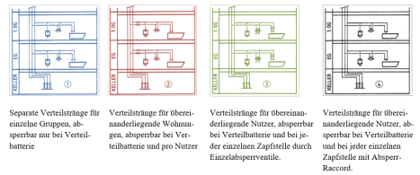 Die Verbindungsröhren zu den Wandhydranten sollten sich hinter dem Wasserzähler befinden, während die Verbindungsröhren zu Innenhydranten vor dem Wasserzähler angebracht werden sollten oder eine Umgehungsleitung eingerichtet werden muss, um die Wasserversorgung jederzeit sicherzustellen.