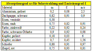 Dieser Effekt kann einerseits vorteilhaft sein, um eine zusätzliche Erwärmung zu erreichen, ist aber andererseits unerwünscht, wenn es um das Kühlen von Räumen geht. Daher hat die Wahl der Materialien auch wirtschaftliche Auswirkungen auf die Betriebskosten. Die Tabelle unten zeigt die Absorption und Emissivität der einfallenden Sonneneinstrahlung.
