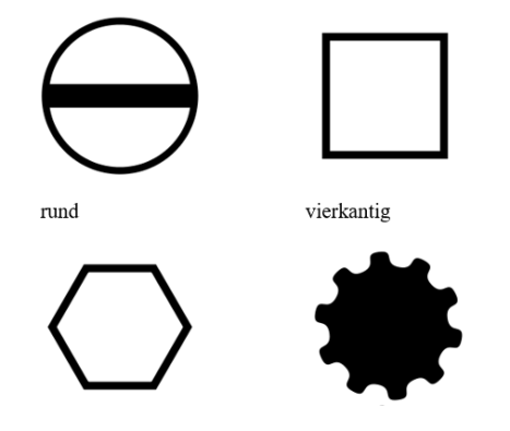 Die häufigsten Profile am Schraubenkopf zum Ansatz eines Schraubendrehers oder Schraubenschlüssels sind: