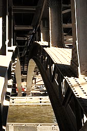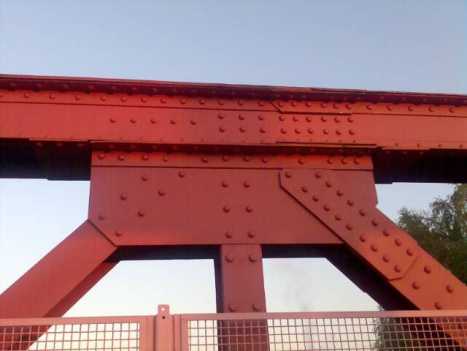 Das folgende Bild zeigt eine Brücke, bei der der linke Brückenbogen bereits renoviert wurde. Gemäß modernen Praktiken wurde Schweißen anstelle von Nieten verwendet.