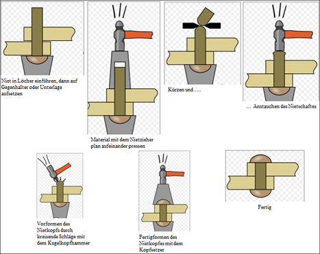 Es wird grundsätzlich zwischen Kalt- und Heißnieten unterschieden. Bei Nietdurchmessern von weniger als 8 mm wird das Kalt-Nieten verwendet. Bei größeren Abmessungen kommt das Heißnieten zum Einsatz. Bei diesem Verfahren wird der Niet, oft bis zu einem gelblichen Schimmer im Schmiedefeuer, erhitzt, in sein zugewiesenes Loch eingeführt und der Kopf wird dann mit einem spezialisierten Werkzeug, bekannt als Kopfsetzer, geformt. Ein besonderer Aspekt des Heißnietens ist das anschließende Schrumpfen des Niets beim Abkühlen. Dies führt zu einer engen Passung, wodurch die Reibung zwischen den Teilen erhöht wird und die Verbindungsfestigkeit verbessert wird.