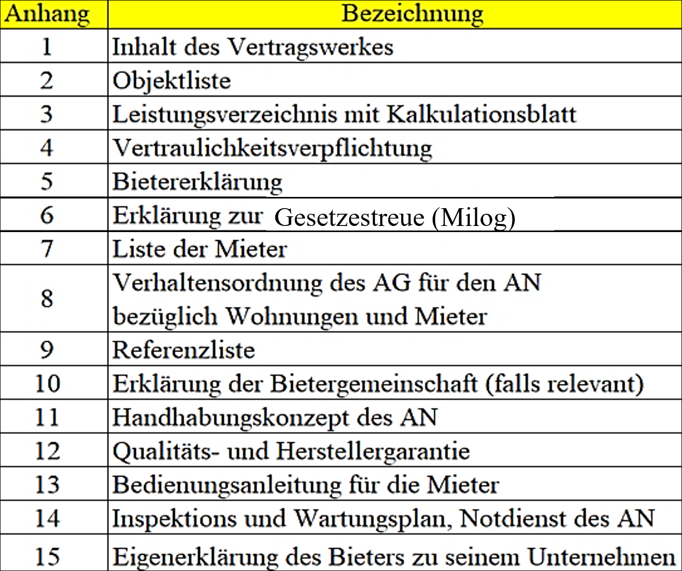 Zu den Ausschreibungsunterlagen gehören neben dem eigentlichen Vertragstext eine Reihe sinnvoller ergänzende Unterlagen. Das folgende Bild enthält hierzu einige Empfehlungen.