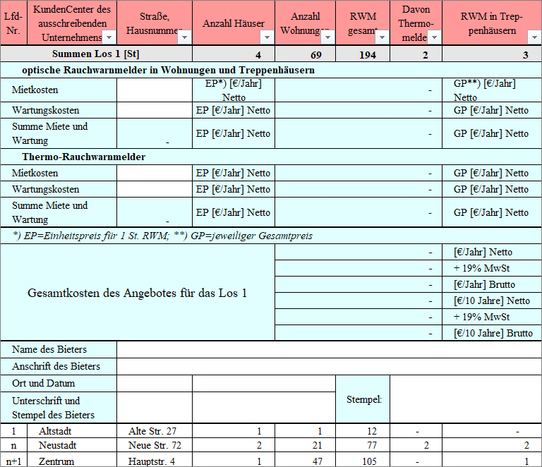Dem späteren Auftragnehmer, der die Deinstallation der vorhandenen RWM, die Neuinstallation und die spätere Wartung übernehmen soll, muss (neben allen notwendigen Informationen zur Erstellung seines Angebotes) letztlich eine schlüssige Preisliste übergeben werden, in die er seine Angebotspreise einträgt. Diese eingetragenen Angebotspreise müssen zudem unanfechtbar und nach wirtschaftlichen Kriterien vergleichbar sein.