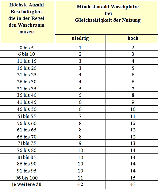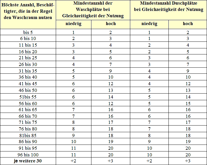 Waschräume sind mit einer ausreichenden Anzahl von Wasch- und Duschplätzen gemäß Tabellen 4, 5.1 und 5.2 in der ASR 4.1 zur Verfügung zu stellen. Die dort angegebene Mindestanzahl darf nicht unterschritten werden. Ist in bestehenden Arbeitsstätten die Bereitstellung der geforderten Anzahl von Wasch- und Duschplätzen mit Aufwendungen verbunden, die offensichtlich unverhältnismäßig sind, so ist zu prüfen, wie durch andere oder ergänzende Maßnahmen die Sicherheit und der Gesundheitsschutz der Beschäftigten in vergleichbarer Weise gesichert werden kann. Dies kann beispielsweise durch Verminderung der Gleichzeitigkeit erfolgen.