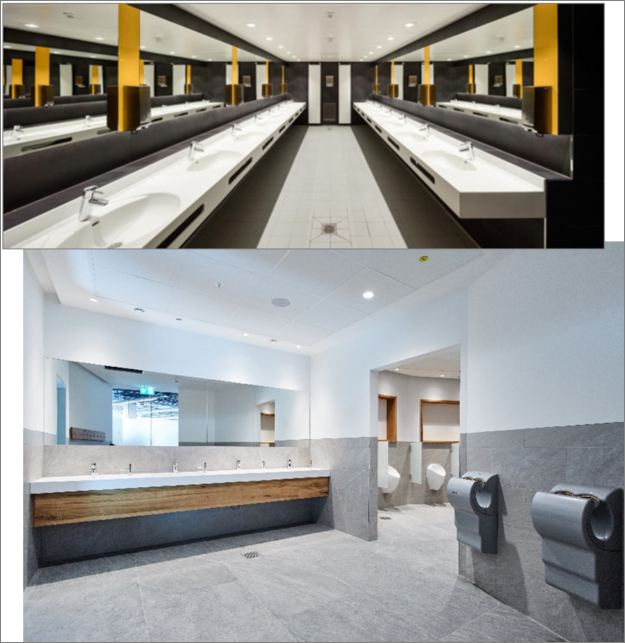 In Sportstätten wechseln häufig die Belegungen, auch zwischen Männern und Frauen. Deshalb soll bezüglich der Sanitäreinrichtungen in Sportstätten kein Unterschied zwischen den Bereichen für Frauen und Männer gemacht werden. Jeder Umkleidebereich soll eine Sanitärzone gleicher Ausstattung haben.