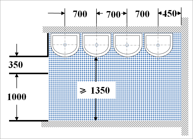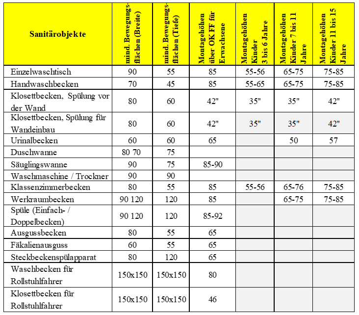 Die Oberkante der Waschrinne, -becken und -brunnen soll sich 0,80 bis 0,90 m über dem Fußboden befinden. Die Breite einer Waschstelle soll 0,70 m, und ihre Tiefe möglichst 0,55 m betragen.