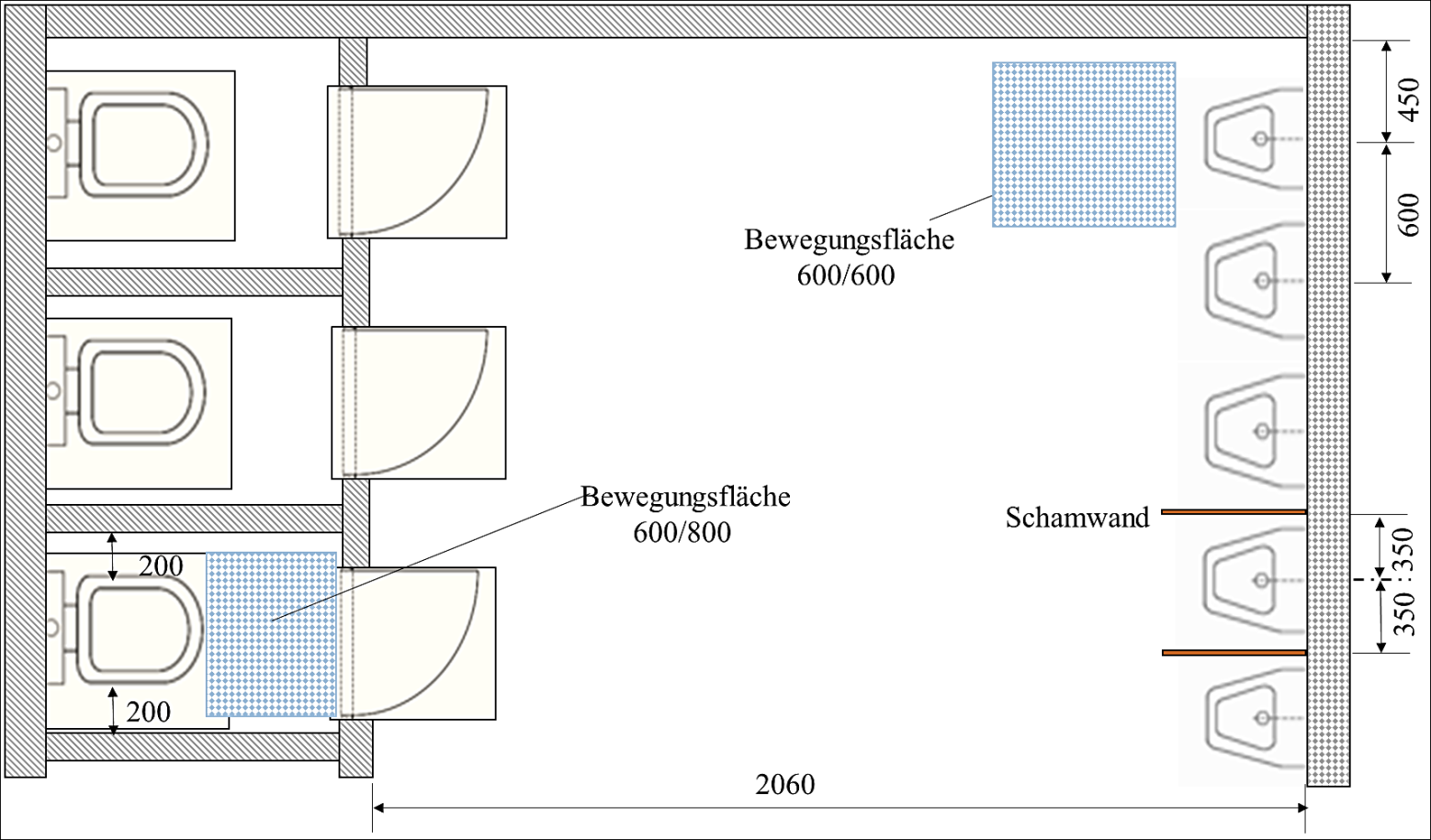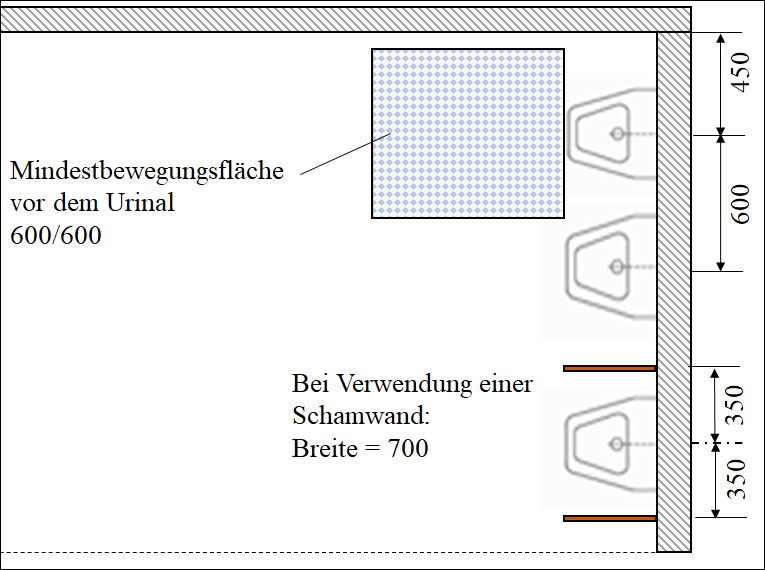 Zwischen den Urinalbecken sollen Trennwände (Schamwände) angebracht sein.