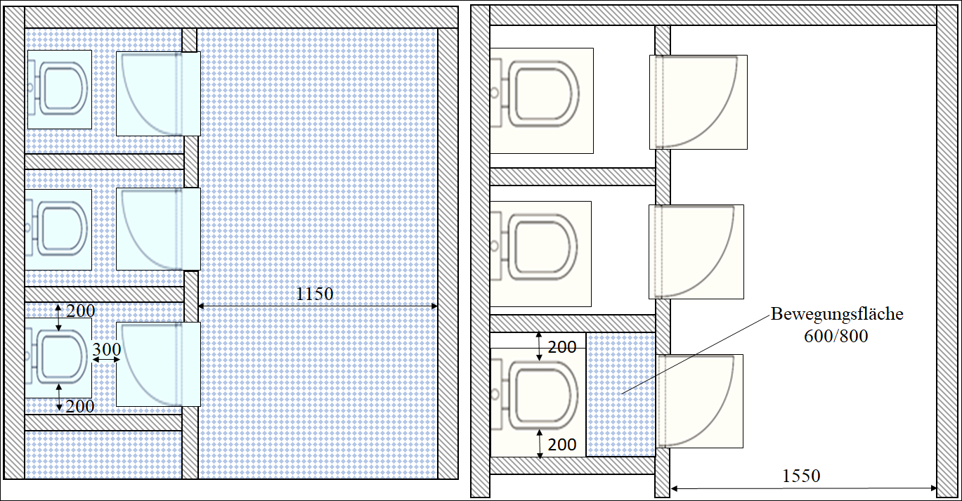 weiterhin einem Raum mit mindestens einer nicht voll-ständig abgetrennten Toilettenzelle, die eine Waschge-legenheit hat und ausreichenden Sichtschutz zu den Toilettenzellen bietet.