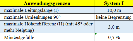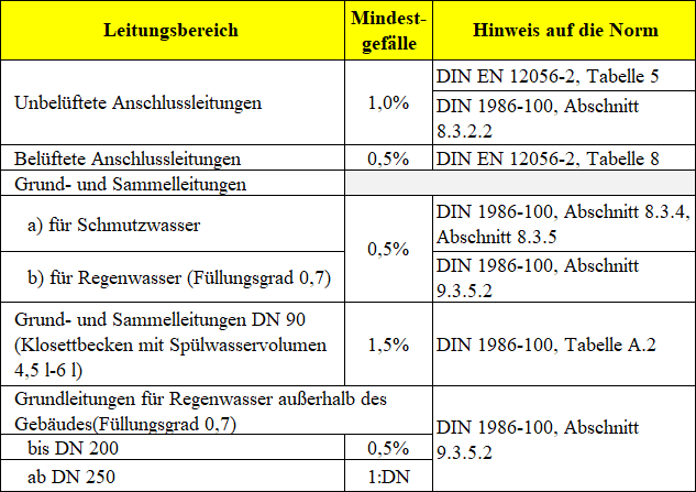 Dadurch ist es möglich, insbesondere Anschlussleitungen mit weniger Gefälle zu verlegen, als es bisher erforderlich war. Die nachstehende Tabelle enthält das jeweilig notwendige Mindestgefälle.