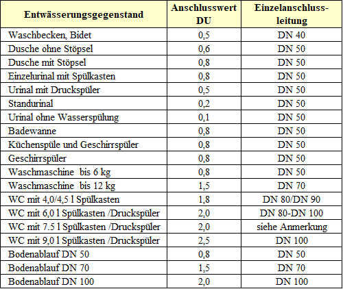 Klosetts mit 7,5 l Spülungen sind im Geltungsbereich dieser Norm nicht gebräuchlich. Aus diesem Grunde wurde dem Entwässerungsgegenstand in der Tabelle keine Nennweite für die Einzelanschlussleitung zugeordnet.