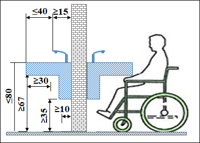 Für Rollstuhlfahrer müssen die Waschtische unterfahrbar sein (Freiraum für die Beine 55 cm, 90 cm breit). Darüber hinaus gelten folgende Vorgaben:
