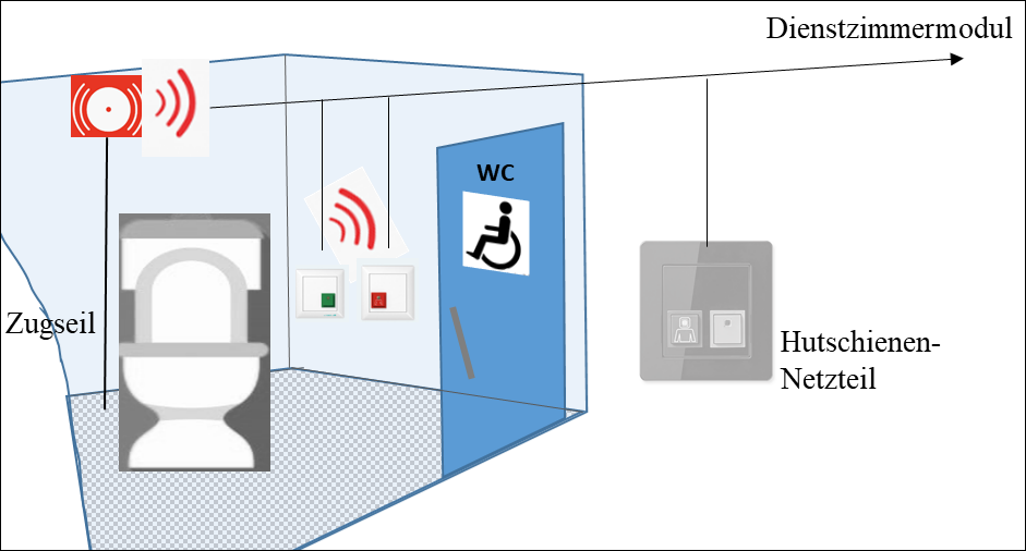 Der Notruf muss vom WC-Becken aus sitzend und vom Boden aus liegend ausgelöst werden können, d. h. Ausstattung des WC-Raumes mit jeweils einem Ruftaster im Zugriffsbereich vom WC-Sitz und Handwaschbecken, einem Zugtaster mit Griff in Bodennähe für am Boden liegende Personen