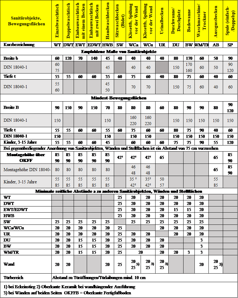 Maße von Sanitärobjekten, Bewegungsflächen und Abständen (VDI 6000) Bewegungsflächen dürfen sich überlagern.